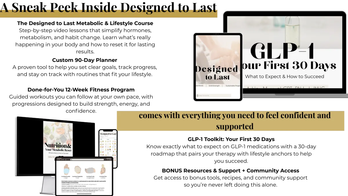 GLP-1s (like semaglutide and tirzepatide) help regulate blood sugar, appetite, and insulin response — but they’re not a magic fix. In Designed to Last™, we help you use them strategically, with full support to prevent common side effects and regain.