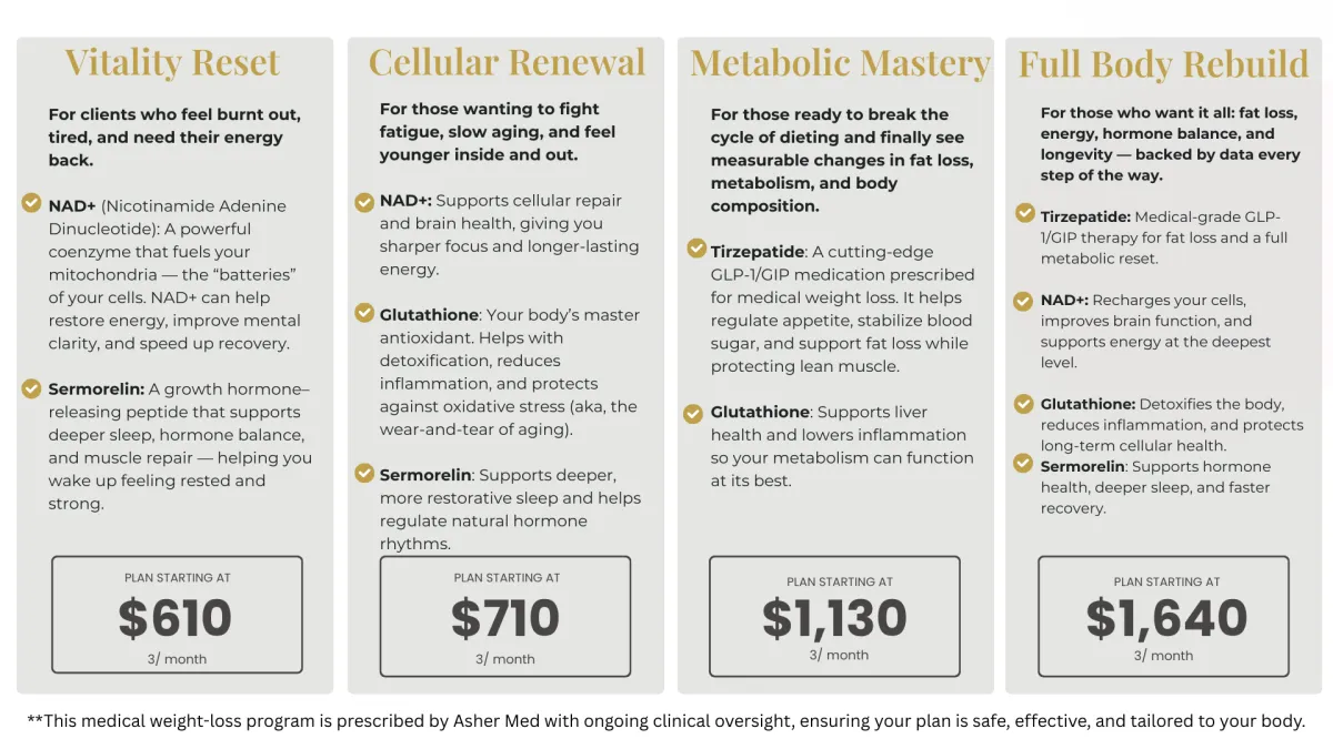 Confidently use peptides like GLP-1, Sermorelin, NAD+, and Glutathione — with prescriptions and full medical support INCLUDED through Asher Med